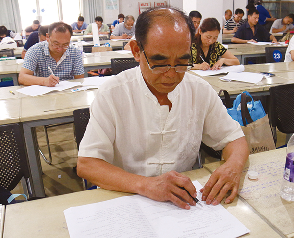 中国书法家协会考级中心主任助理、文化部社会艺术专业考官翟卫民在考级中心主任曹晓林的陪同下亲临考场观看考生考试